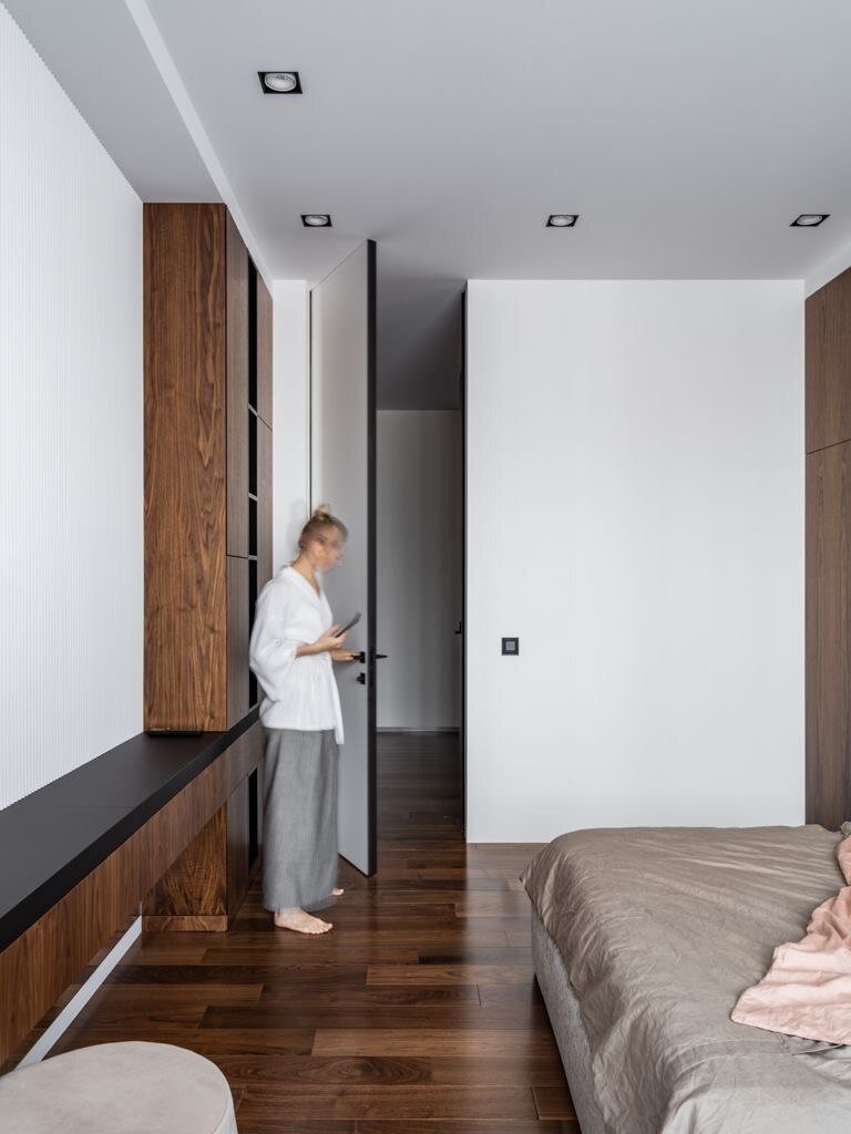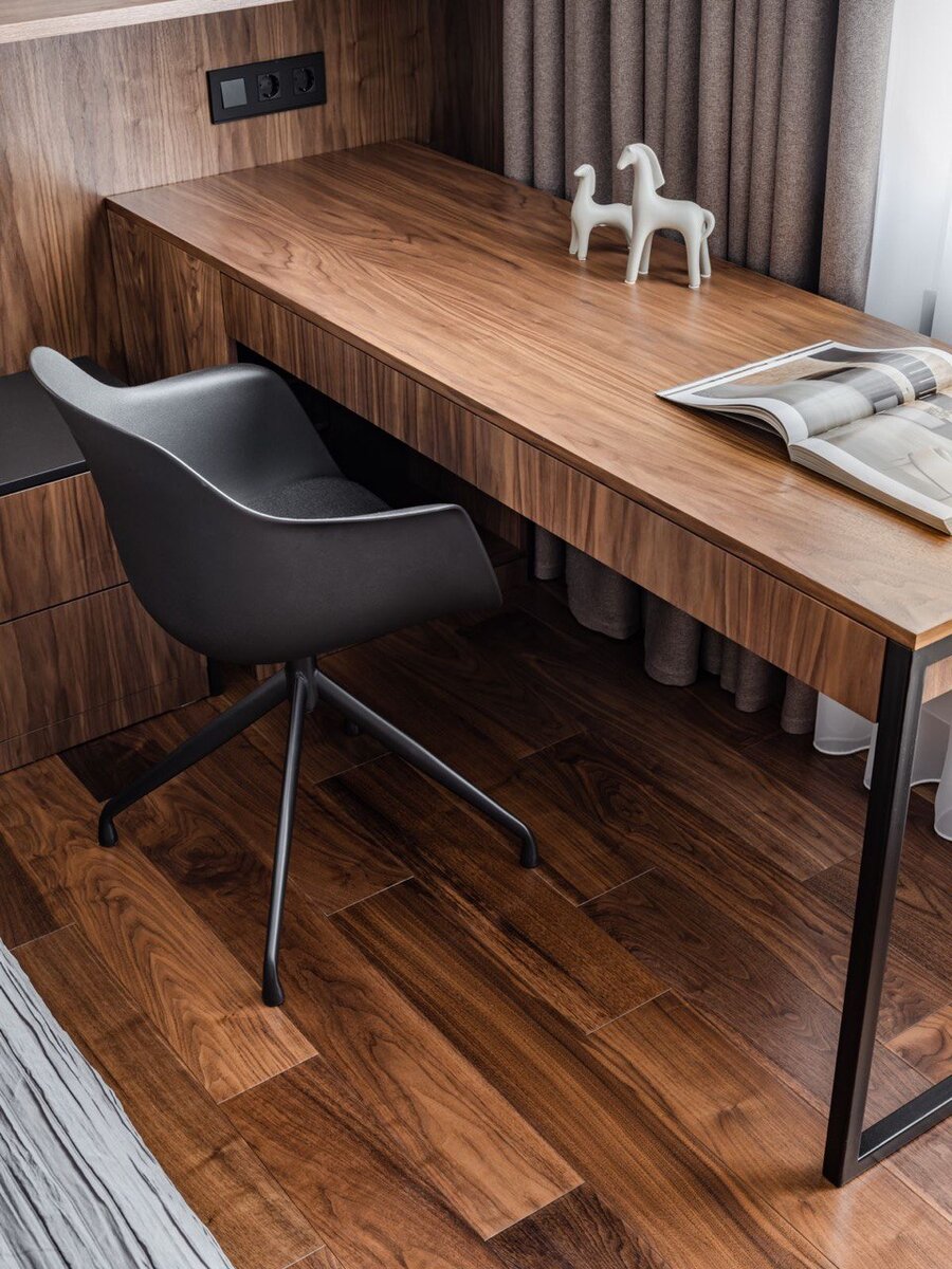 На фото представлен реализованный проект в Краснодаре, где использована инженерная доска из американского ореха в селекции «Селект». Этот пример наглядно демонстрирует, как такое покрытие добавляет интерьеру глубины и статусности.