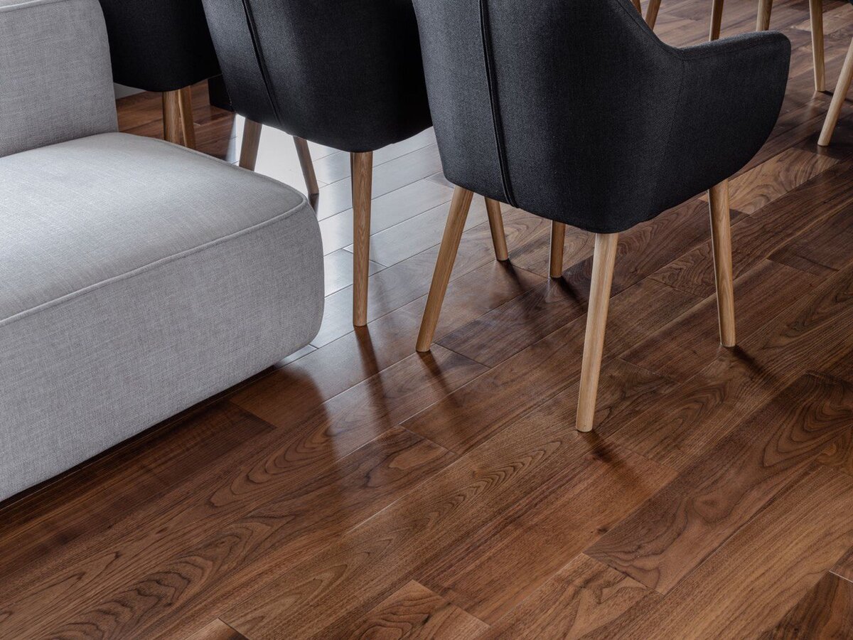 Американский орех обладает богатой, глубокой цветовой палитрой — от теплых золотисто-коричневых до насыщенных шоколадных тонов с выразительной текстурой. Такой пол выглядит дорого, солидно и добавляет интерьеру роскоши.