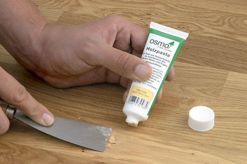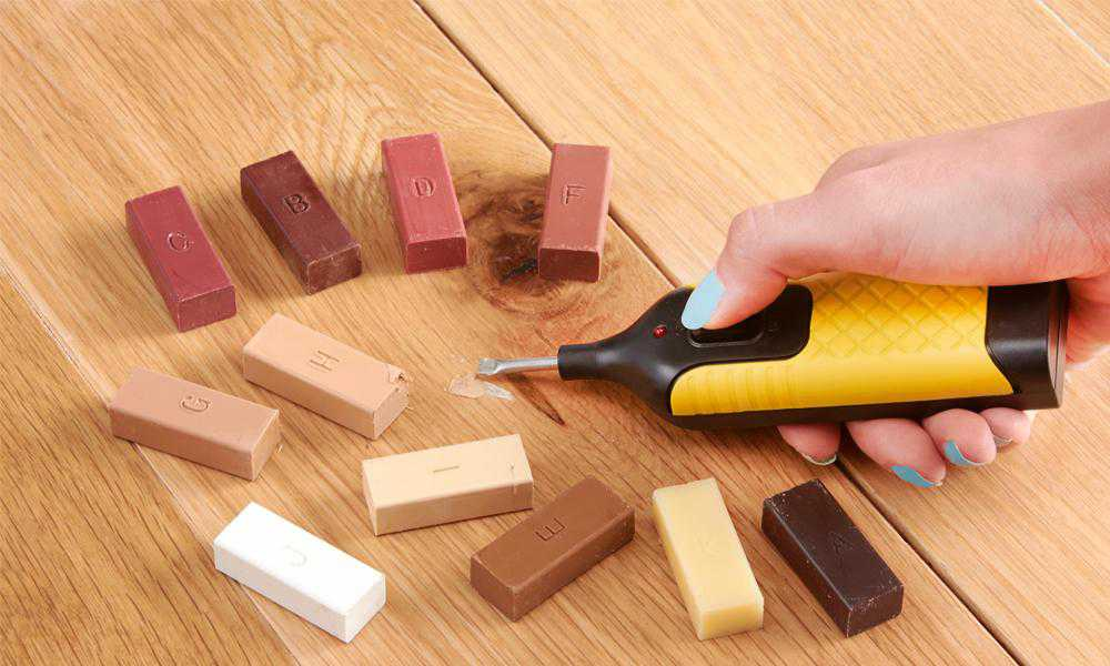 - Подберите колер для замазки, максимально близкий к цвету вашего ламината, чтобы место ремонта было менее заметным.