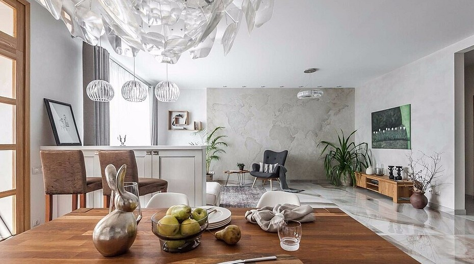 Один из главных принципов — единство напольного покрытия. Использование одного и того же материала без стыков и переходов между смежными зонами (например, между кухней и гостиной в студии) объединяет пространство, делая его монолитным и более широким.
