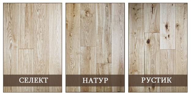 Поскольку паркет изготавливается из натурального дерева, его внешний вид напрямую зависит от исходного сырья. Древесина сортируется по наличию природных особенностей: сучков, заболони, перепадов цвета и текстуры. Выделяют три основных сорта: