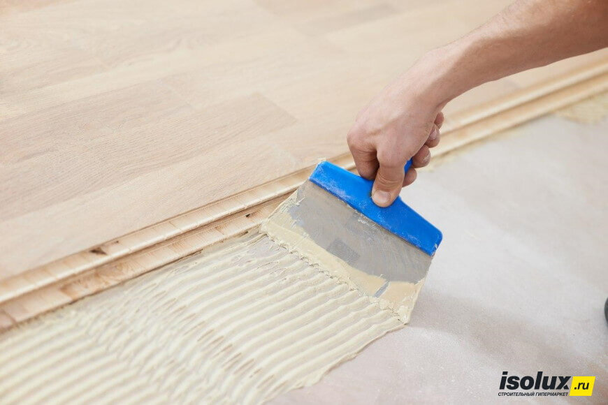 2. Нанесение клея и укладка: Используйте только специальный паркетный клей, рекомендованный производителем доски. Нанесите клей зубчатым шпателем на участок пола (площадью примерно 1 кв.м) или на тыльную сторону нескольких досок.