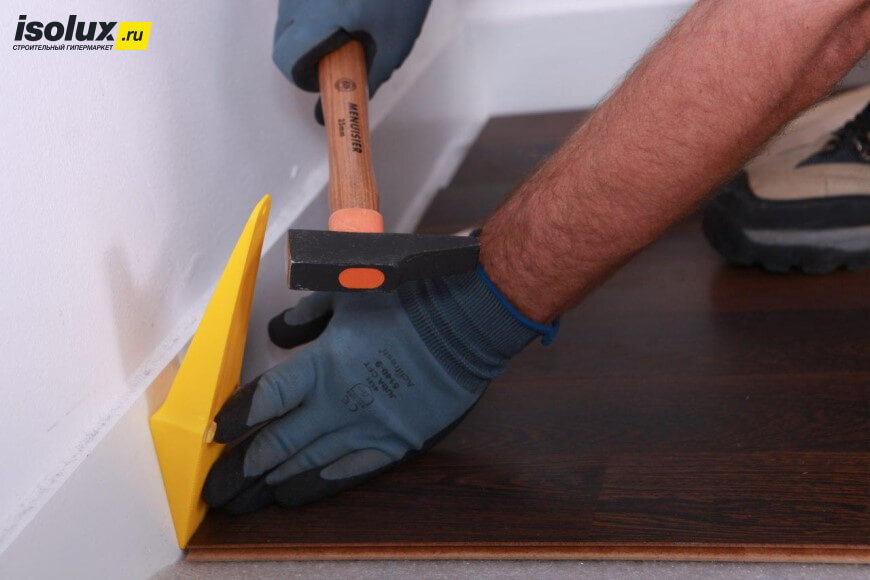 6. Подгонка и фиксация: Для плотной посадки используйте резиновый молоток и подбойник, аккуратно простукивая доски через брусок, чтобы не повредить замок.