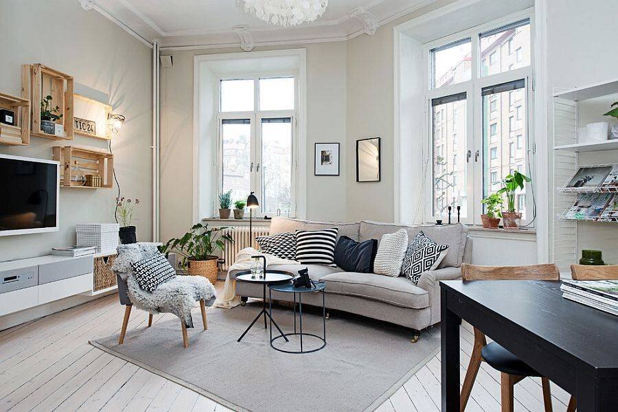 Классическое сочетание черного и белого также часто встречается в скандинавских интерьерах, добавляя им контраста и четкости. Несмотря на любовь к природным текстурам, в декоре преобладают геометрические и абстрактные узоры. Важно не перегружать пространство: узоры и яркие цвета должны присутствовать в ограниченном количестве предметов, например, в коврах, подушках или настенных постерах.
