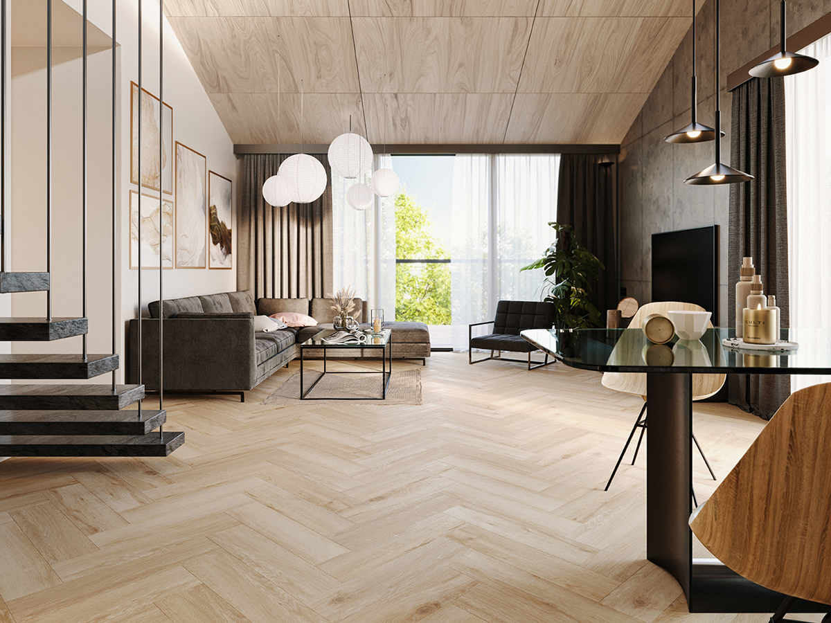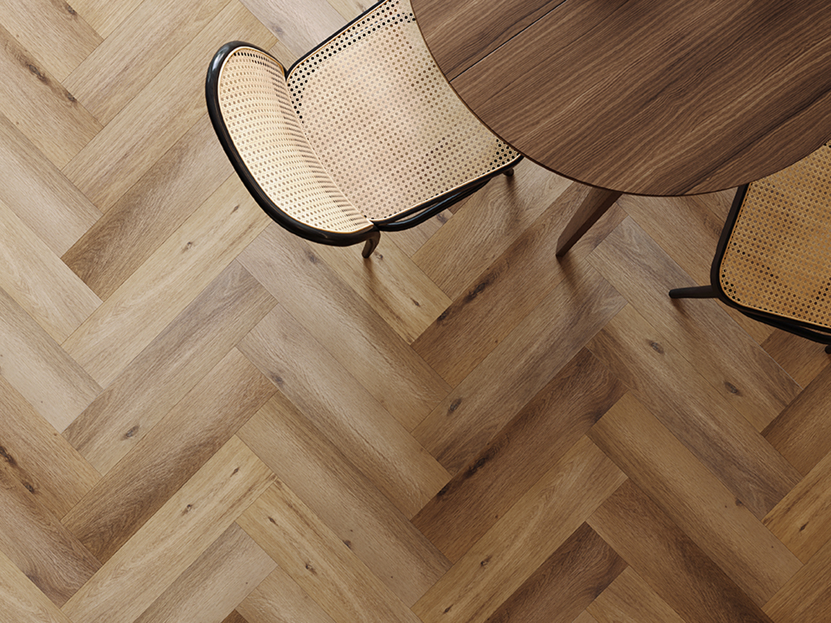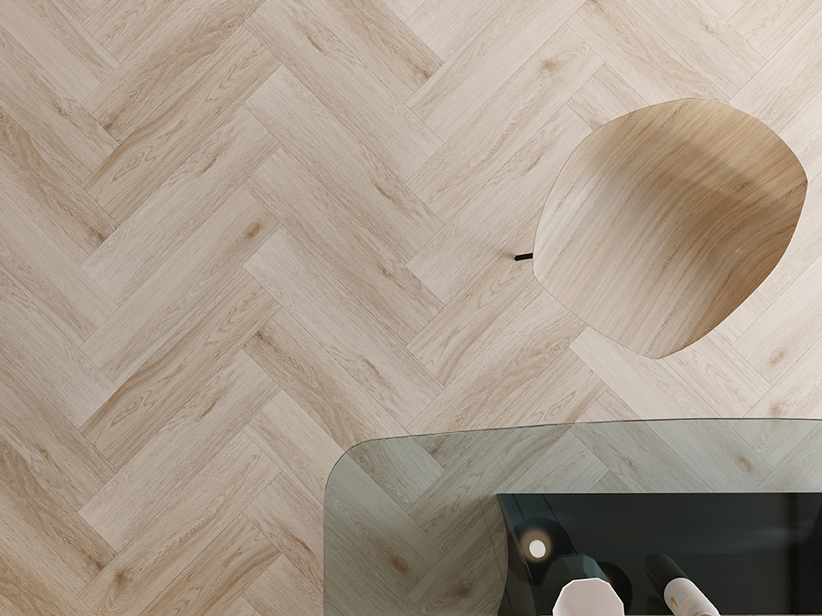 Инновацией, которая кардинально меняет подход к классическому дизайну, стали виниловые панели с минеральным сердечником. Бренд Arbiton представил коллекцию Amaron Herringbone — первые в мире виниловые панели с технологией HD MINERAL CORE®, которые монтируются по системе клик (замковое соединение) и позволяют легко создавать узор "елочка". Это решение объединяет эстетику натурального дерева с высочайшей практичностью. Панели абсолютно водонепроницаемы, обладают повышенной износостойкостью (класс 33.42) и идеально подходят для укладки на системы "теплый пол", а также в помещениях с повышенной влажностью — кухнях и ванных комнатах.