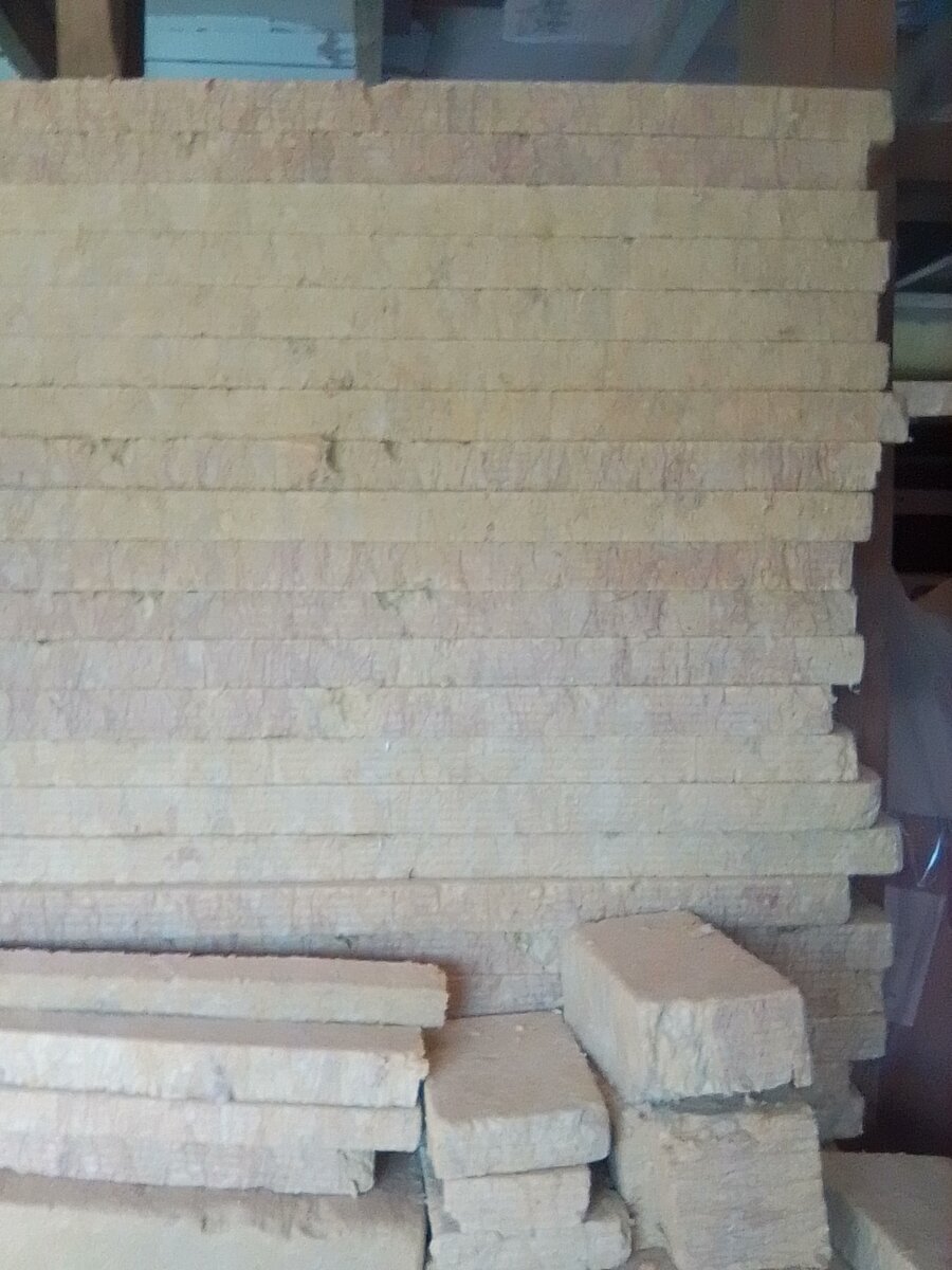 Не надо потом запенимать места стыков. И конечно же цена тоже тут играет роль. За один куб минеральной ваты мы заплатили всего 400 рублей.Вот такая разная была минеральная вата от 1 см до 15 см и больше. Да конечно, такими обрезками дольше пришлось утеплять дом. Тут сыграла роль цена и тепловые качества минеральной ваты.