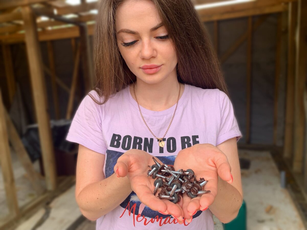 Как мне муж пояснил, прикрутить листы —это реально недолго, там больше проблема именно их на крышу закидывать. Когда делаешь это в одни руки, нужно установить направляющие, положить на них лист, сверху пробить его гвоздем, чтобы вставить крючок с веревкой, залезть на крышу и затянуть. И так с каждым листом. А тут он сидел на крыше, а ребята подавали ему листы, я изредка подавала ему саморезы. Собственно, это и была моя функция —подавать ему саморезы. При этом опять вспомнили, что куда-то потеряли магнитный браслет под них и что нужно новый приобрести. Погода при этом хмурилась так, что муж крутил саморезы без перекуров, чтобы успеть до дождя.