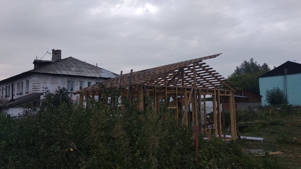 Ну вот, наша эпопея со строительством бани подошла к знаковому этапу. Все-таки когда у здания появляется кровля, оно уже выглядит практически законченным. В прошлый рабочий день нам удалось полноценно поработать. Пока муж собирал стропильную систему, я обрабатывала повторно антисептиком некоторые элементы. По окончанию работ муж снизу поставил доски, которые пошли на обрешётку, чтобы на следующий день с утра их уже на крышу поднимать спокойно и монтировать. Я у него спрашивала, а как мы будем поднимать листы, предлагала нанять кого-то,зная, что одному это делать можно, но очень долго. Из меня в этом вопросе помощник так себе. Но он сказал, что договорился со знакомыми, что как только он смонтирует обрешётку, они приедут и помогут поднять листы.