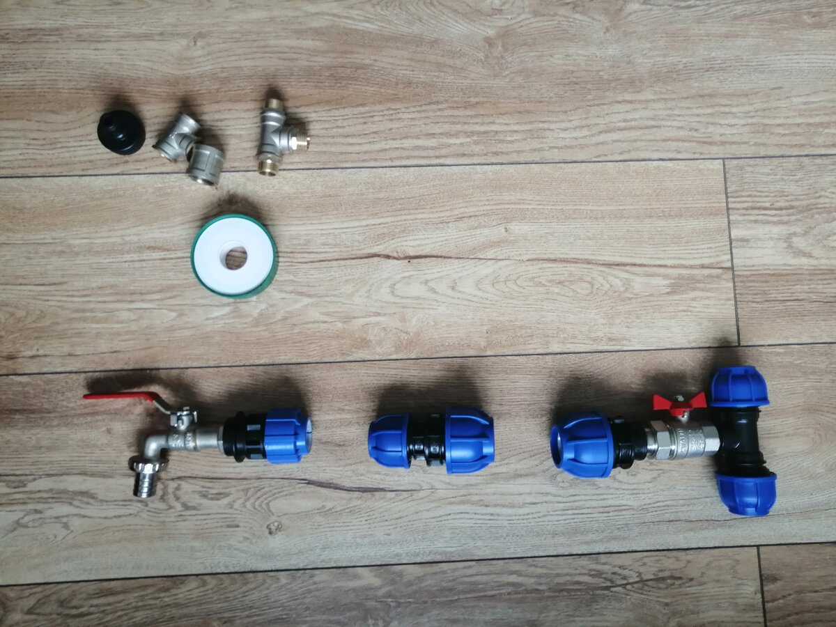 Разводку с компрессионными фитингами я собрал дома. Если у вас сложная система, обязательно нарисуйте схему и посчитайте, сколько и каких элементов вам будет нужно. Очень обидно приехать и осознать, что не хватает какой-то детали.