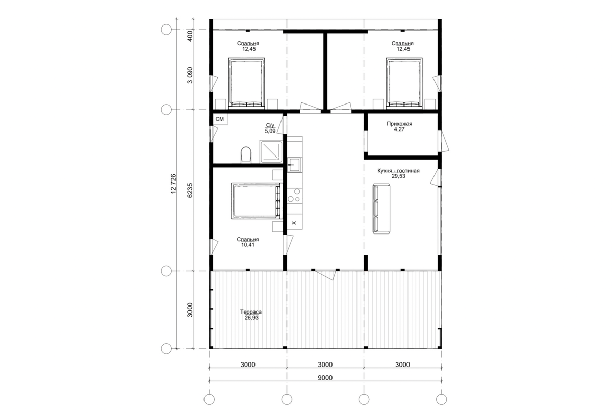 В качестве дополнительных опций: теплый пол в гостиной, боковая терраса и лестница к ней.