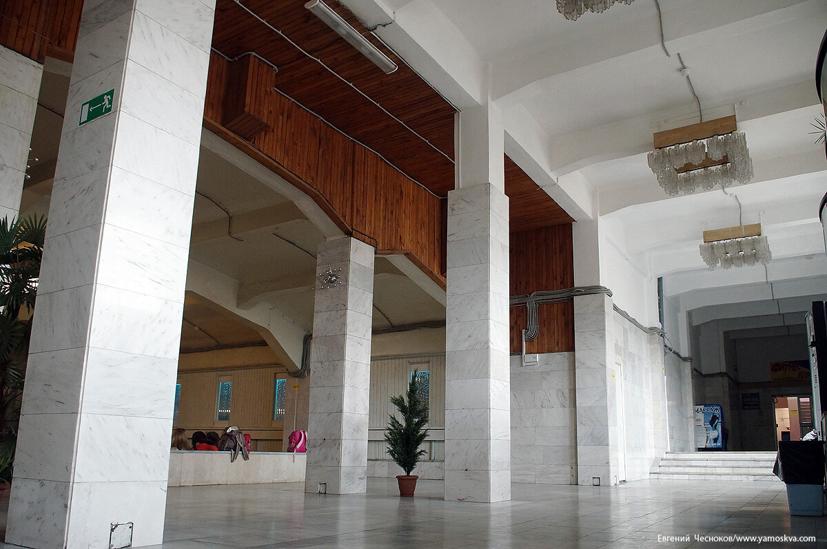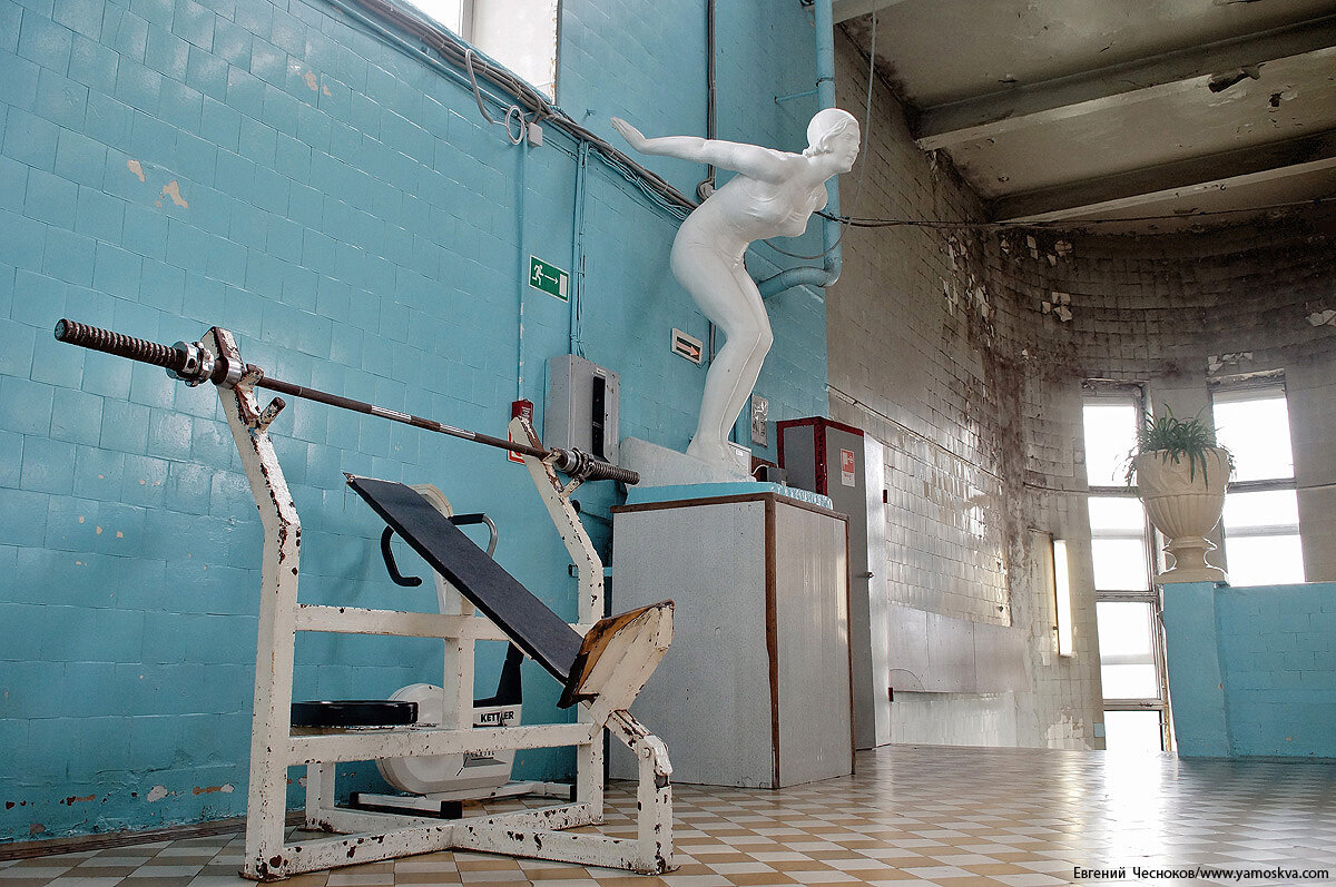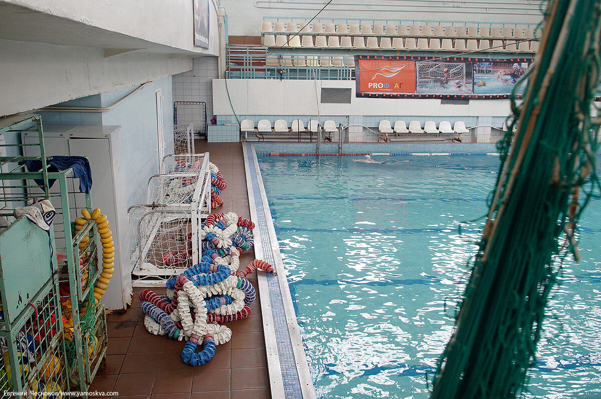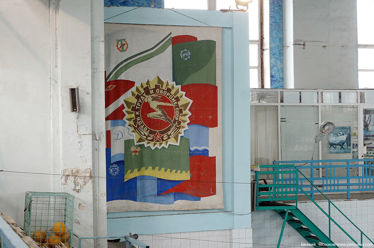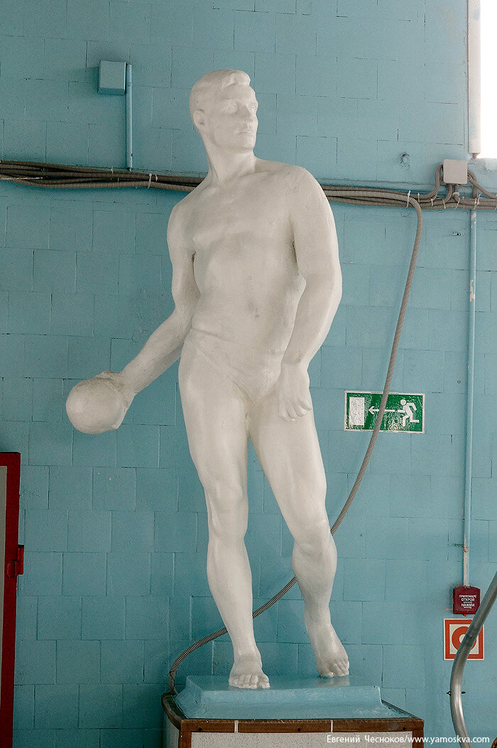 Бани и душевые размещались в боковых крыльях здания, а в центральной части находился бассейн с чашей 25 на 14 метров и глубиной до пяти метров. Примечательно необычное инженерное решение: этот большой бассейн с трибунами для зрителей поднят на высоту второго этажа.За минувшие десятилетия «начинка» бассейна неизбежно менялась в соответствии с новыми требованиями, была демонтирована прыжковая вышка, заменено оборудование, но в оформлении интерьеров сохранились вазоны с советской символикой, метлахская плитка и две гипсовые скульптуры – «Пловчиха» (девушка на старте) и «Спортсмен» (юноша, сжимающий в руке то ли ядро, то ли мяч). Здание могло быть снесено при строительстве Третьего транспортного кольца, но выстояло, хотя и лишилось одного крыла.