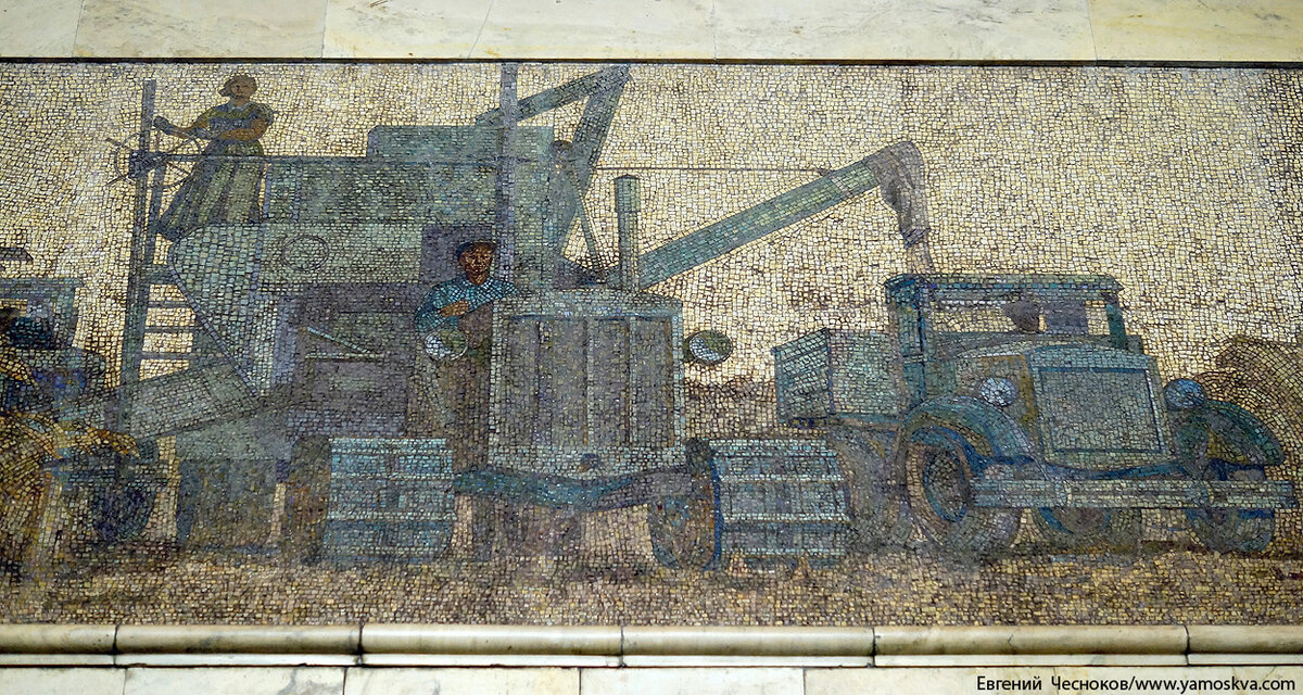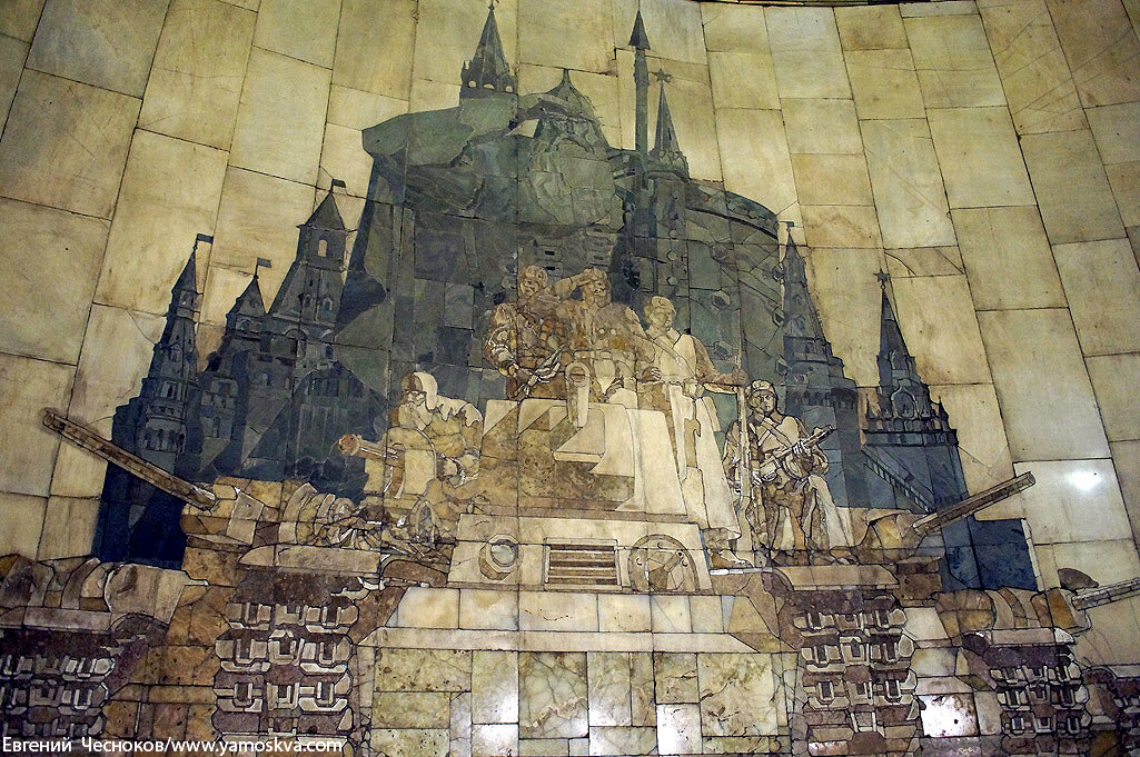 В аванзале напротив эскалатора установлено мозаичное панно, выполненное из разных сортов мрамора. На нём танки проходят парадом по Красной площади, а за боевыми машинами возвышается фигура былинного богатыря. Роспись на потолке вестибюля изображает сцены из жизни рабочих автозавода.