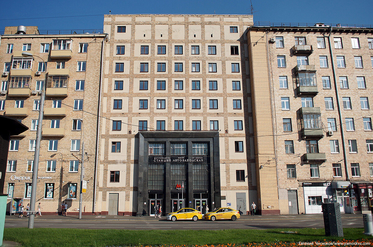 Автозаводская улица, 11 – этот дом построен в 1961 году и необычен тем, что в него вписан уже существовавший ранее павильон станции метро «Автозаводская».