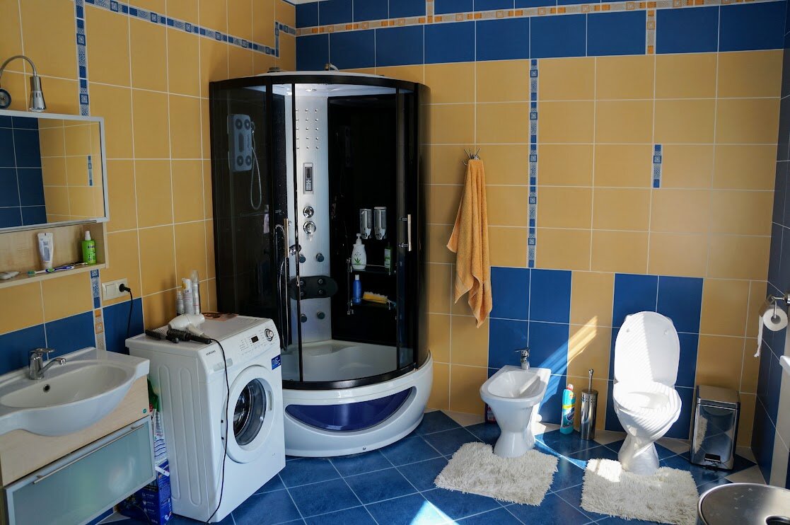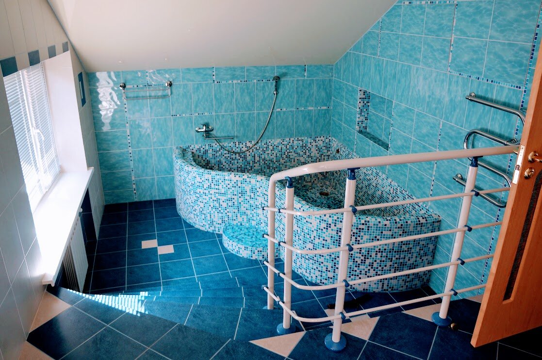 Санузел на втором этаже был с огромной ванной-бассейном. Смешно, что накопительного бака с горячей водой хватало чтобы заполнить ее только по щиколотку.