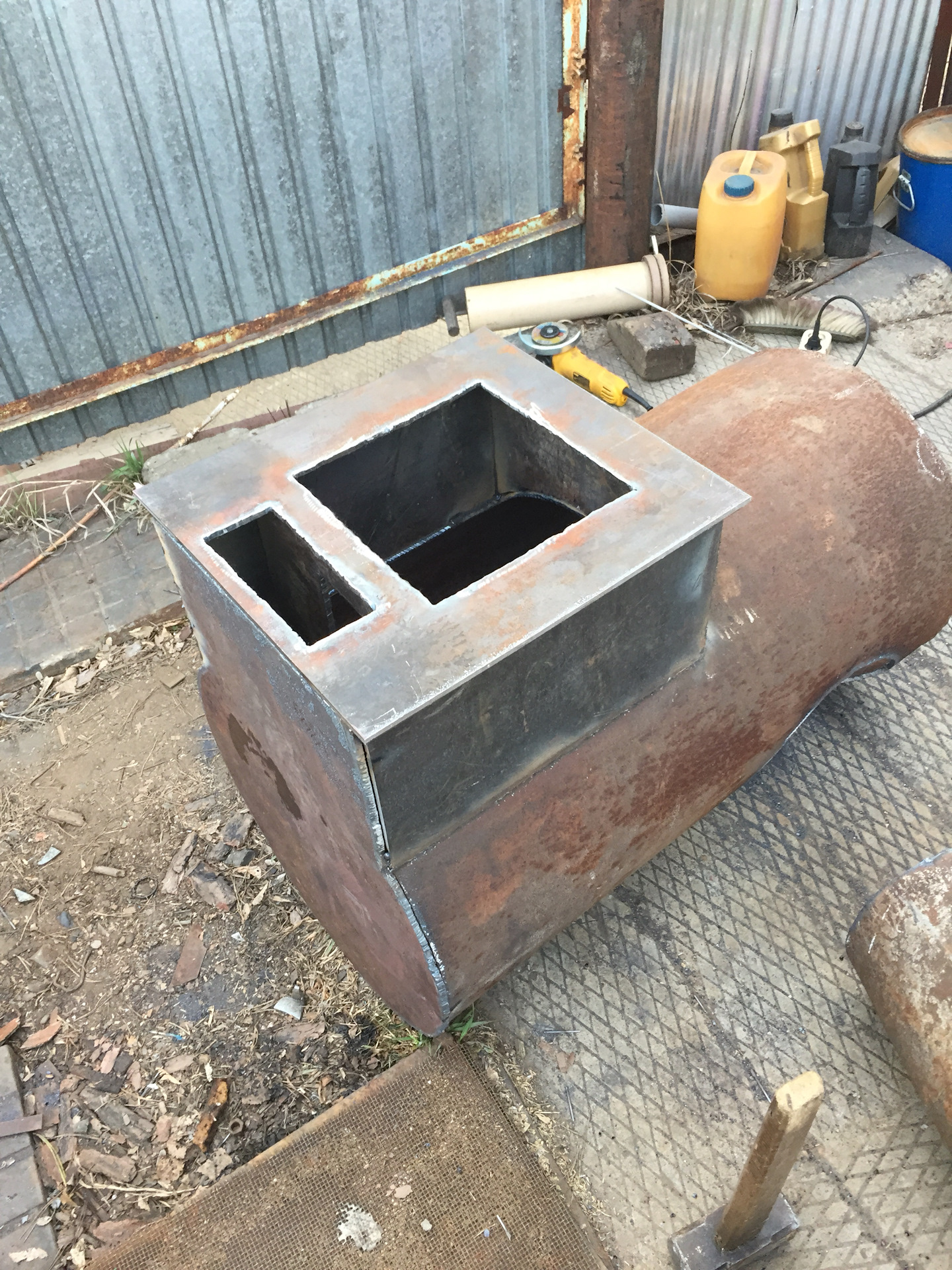 - Подготовка корпусов. Берём две отрезка толстостенной трубы: один (~1 м) для каменки, второй (~0.7 м) для водяного бака.
