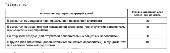 Поэтому и назначают толщину защитного слоя больше, чем возможная глубина карбонизации. Понятно, что в различных средах эта глубина будет разной. Для специальных конструкций, эксплуатирующихся в условиях агрессивных сред, требования устанавливаются отдельно, а для прочих объектов массового строительства такие требования устанавливаются в "базовых" нормах по железобетонным конструкциям:Также раньше при отсутствии бетонной подготовки нормы немного ранее предписывали величину защитного слоя не менее 70 мм. Имелось в виду опирание непосредственно на грунт или песчаную или щебеночную подушку. Сейчас это требование убрали, видимо из предположения, что вместо бетонной подготовки могут быть применены разные решения - как более, так и менее эффективные с точки зрения защиты. Однако конкретики по этому поводу нет.