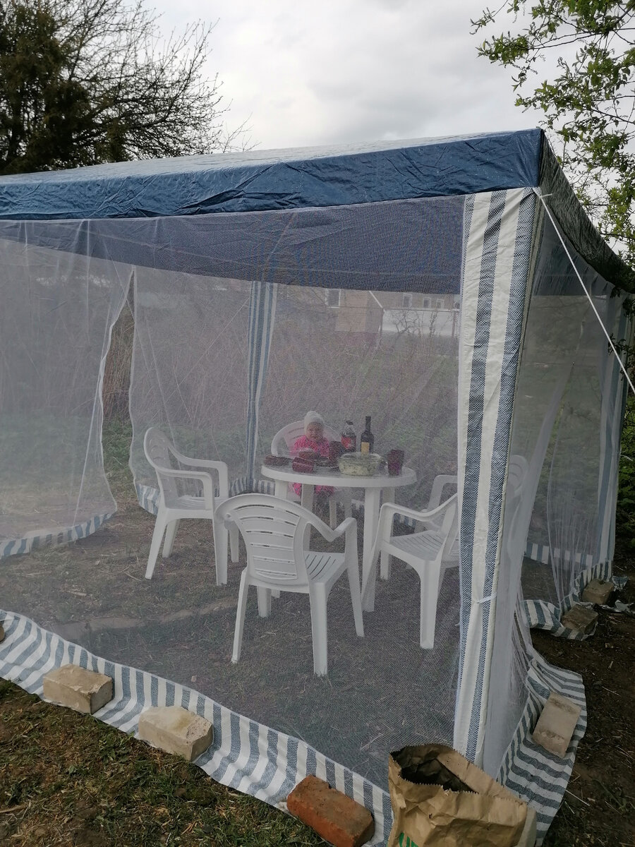 С шатром пришлось нашим мужчинам помучаться. 8 мая был сильный ветер, пока собирали его несколько раз чуть не удуло. Конструкция конечно далеко не самая крепкая, но тест драйв шатер прошёл, ветра у нас сейчас сильные. Дополнительно ещё будем уреплять его. Менять верёвки на тросик и штыри менять на более длинные и прочные. Нужно ещё будет придумать как закрепить брезент или банер на две стенки, чтобы можно было сидеть внутри в дождик. Гирлянду ещё не купила, не знаю нужна ли она там, ведь ночевать мы не остаёмся и до темна уезжаем домой. Может просто для красоты повесим и купим переноску для света, либо кемпинговый фонарь.