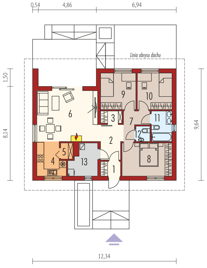 Три спальни удачно сгруппированы вместе с санузлами, образуя спальную зону. Котельная, площадью 5.78 м2 обеспечивает необходимый требуемый объём (не менее 15 кубов и наличие окна) для установки газового оборудования. Для такой площади дома достаточно будет настенного газового двухконтурного котла, размерами с навесной кухонный шкафчик. Остальное место котельной можно использовать для хранения. С учётом котельной мест для хранения в доме вполне достаточно.