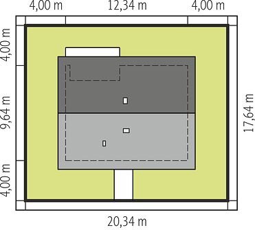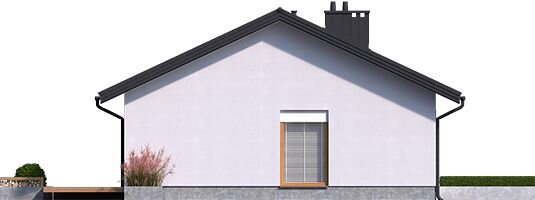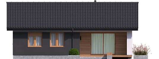 Дом имеет простую прямоугольную форму, с двускатной кровлей с углом наклона всего 25 градусов, благодаря этому высота строения до конька составляет 5.89 м. Всё перечисленное значительно упрощает строительство, а значит экономит деньги застройщика.