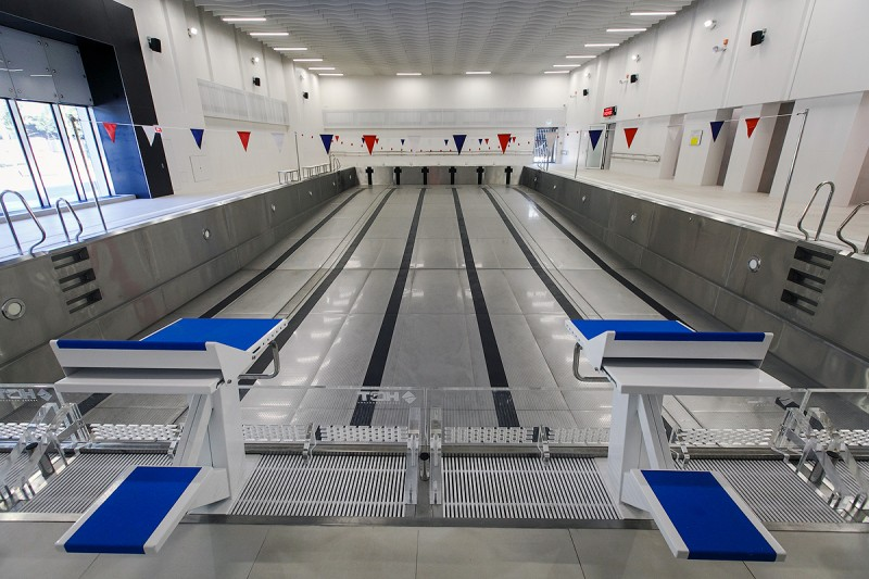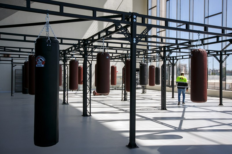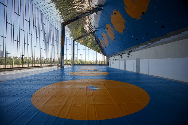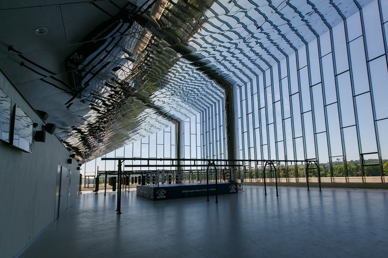 Одна из главных фишек фасада – витражное остекление зеркальных тренировочных залов. Оно позволит наблюдать за тренировками, находясь за пределами здания. Потолок, кстати, тоже зеркальный. Его площадь составляет 3,5 тыс. кв. м.