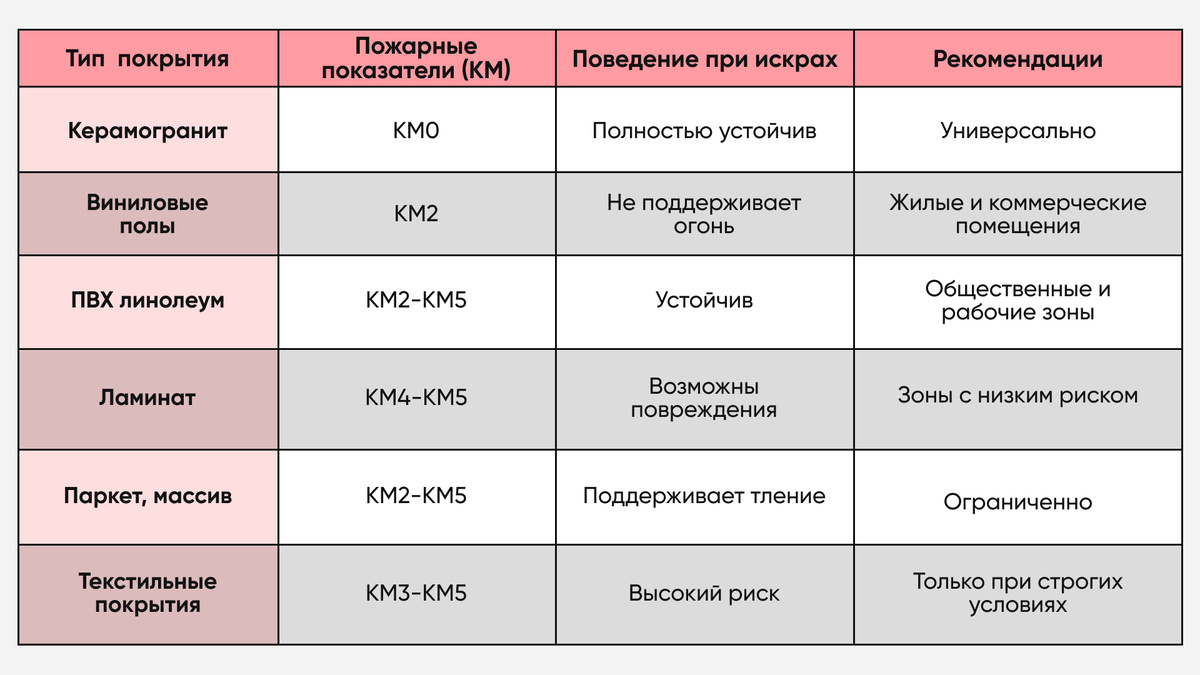 Сравнительный анализ ключевых типов напольных покрытий по параметрам пожарной безопасности позволяет сделать обоснованный и безопасный выбор для любого объекта.