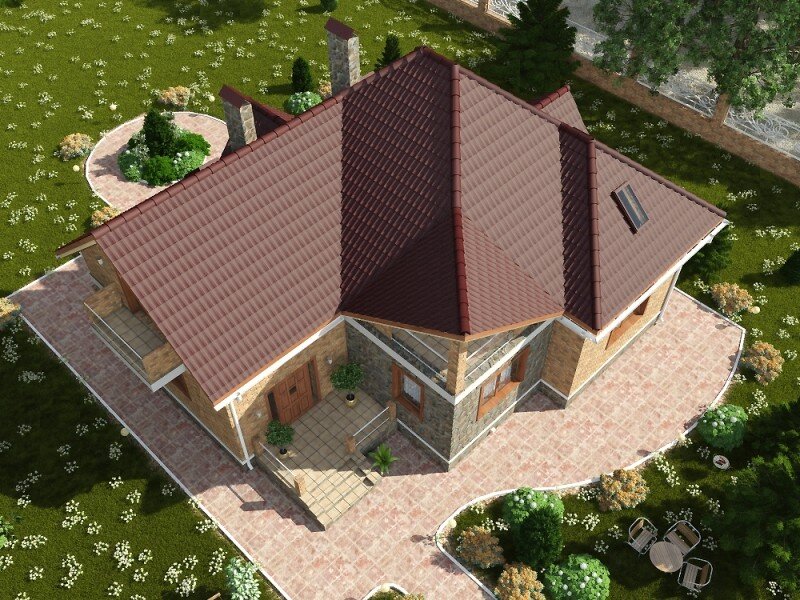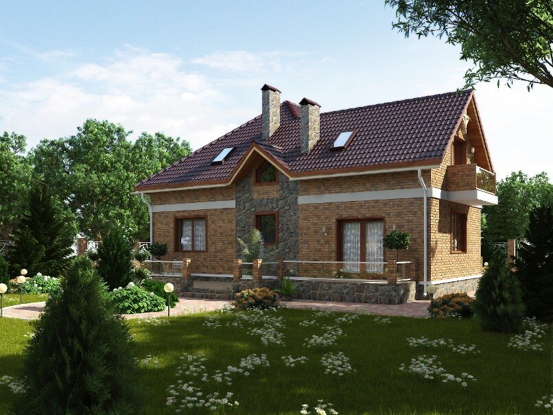 Современный фасад, обшитый натуральным камнем и облицовочным кирпичом, привлекает внимание своей необычной геометрией. Особый шик внешнему облику придают многоскатная крыша сложной конфигурации, покрытая черепицей, и уникальный балкон треугольной формы с колонной.