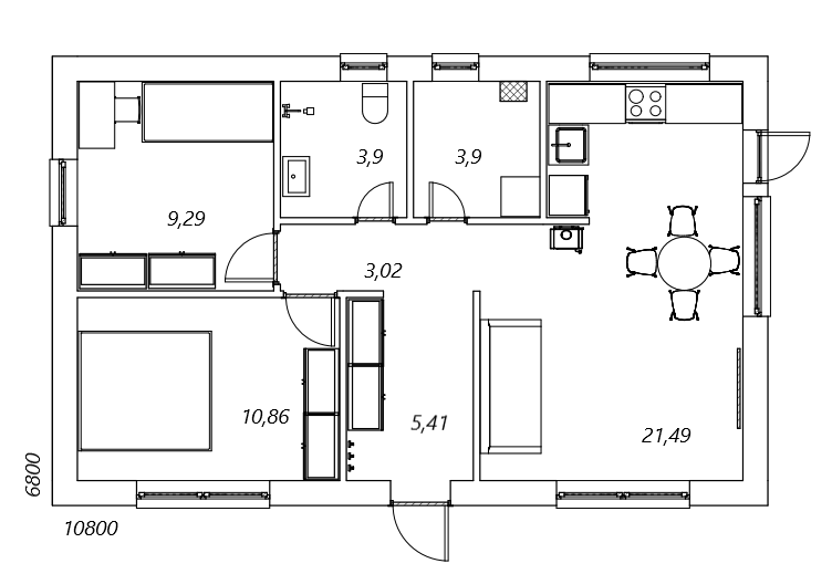 Получается, что на семью из 3х человек требуется минимум 54 м2 общей площади жилого помещения, исходя из нормативов. Если перенести это на дом, то в эти метры может входить домик такого, например, плана: