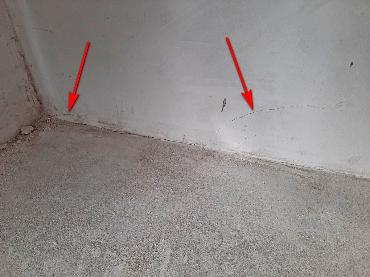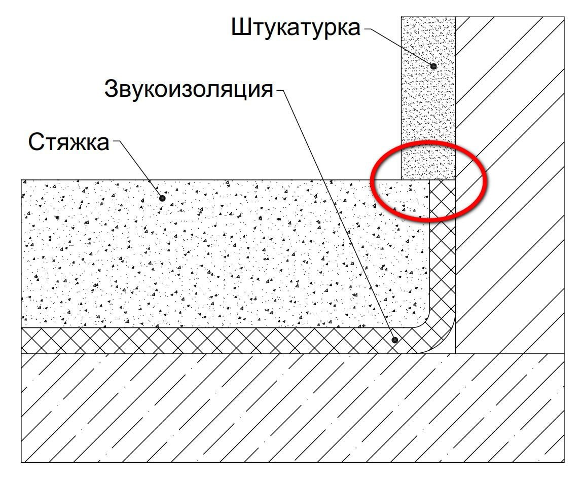 Когда на объекте сперва выполняют стяжку по звукоизоляционному материалу ("плавающий" пол), а после штукатурку, то часто забывают о том, что они не должны соприкасаться и доводят штукатурку до стяжки.