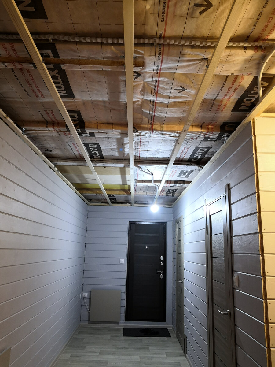 Вчера Миша доделал обрешетку в коридоре и в ванной. А панели еще не куплены, надо в ближайшее время это исправлять.