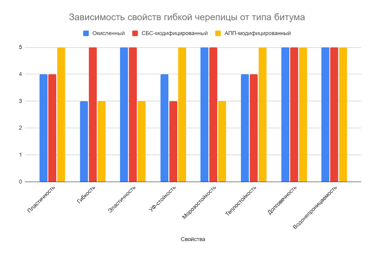 Прочность мягкой черепицы зависит от плотности и качества армирующего основания, за остальные характеристики отвечают пропитка из битума. Поэтому в зависимости от того, какой битум используется, будет изменяться эластичность, гибкость, водонепроницаемость, теплостойкость и другие характеристики гибкой черепицы. Основные параметры приведены на графике. где оценка 5 – высокая, 4 – средняя, 3 – низкая.
